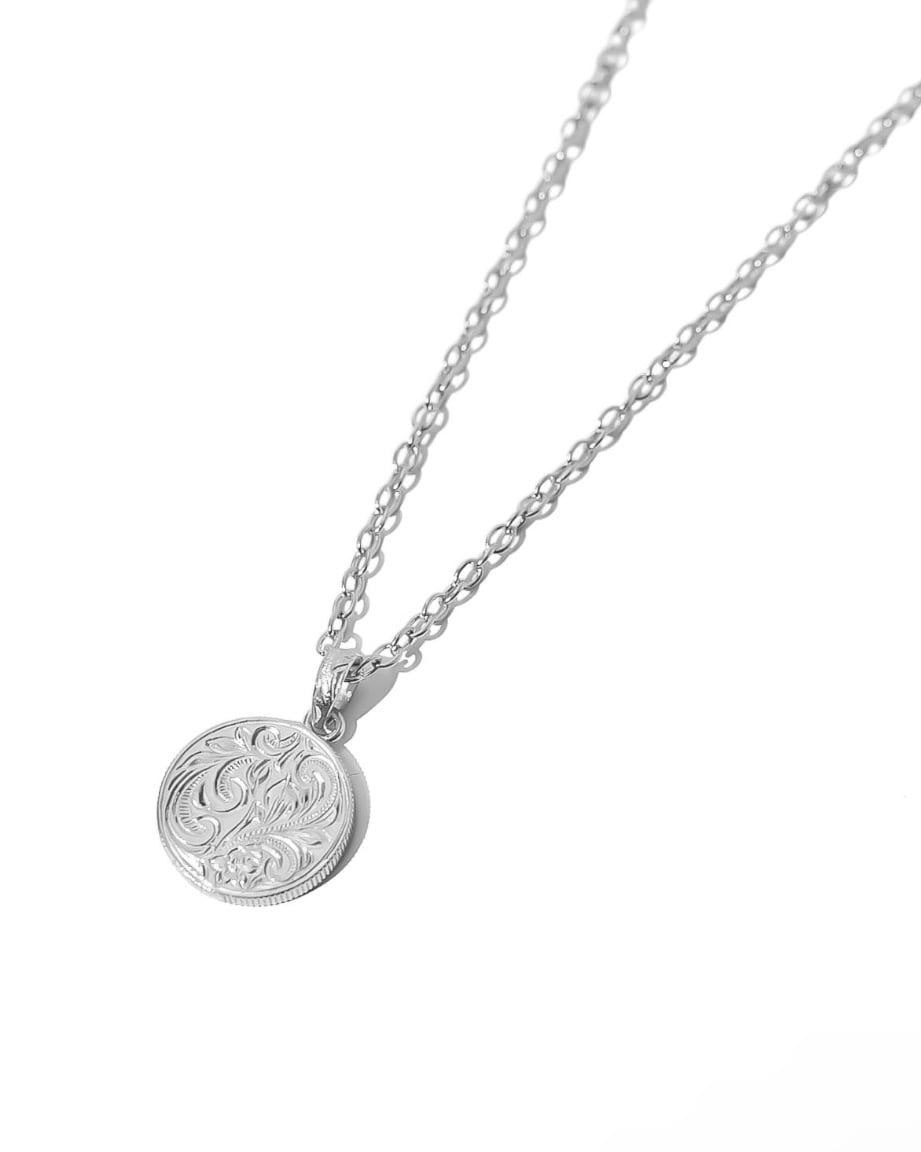 クラシックなデザインにハワイアンのトレンディなテイストを融合させ、裏面にはハワイの自然を称えるヘリテイジ柄を彫り込んだネックレス。